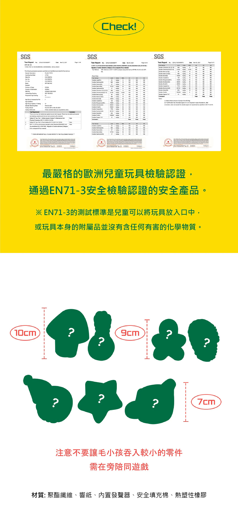 聚酯纖維、響紙、內置發聲器、安全填充棉、熱塑性橡膠