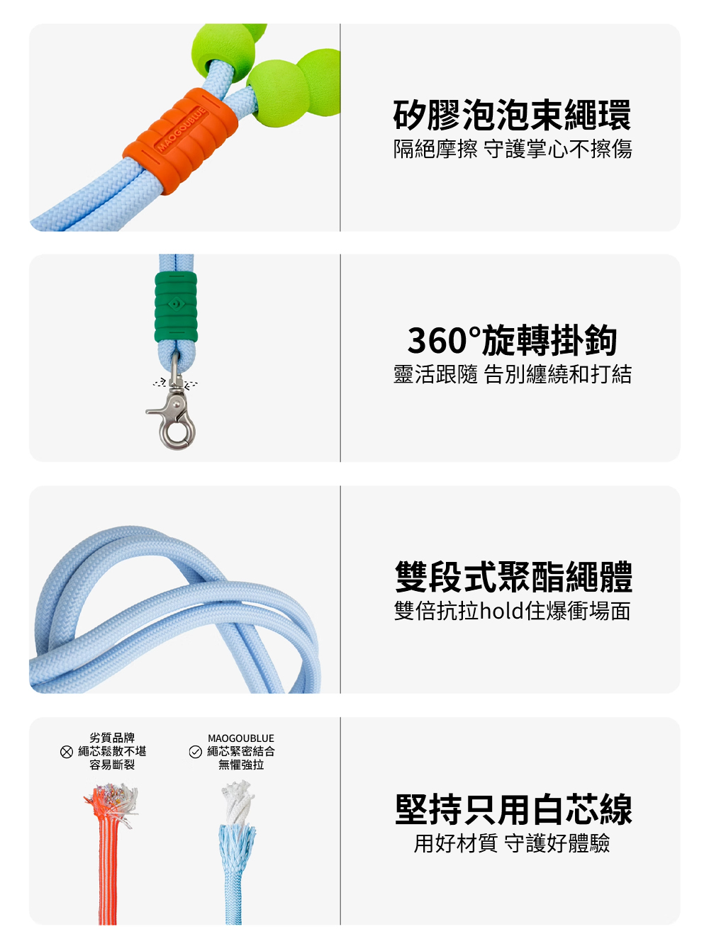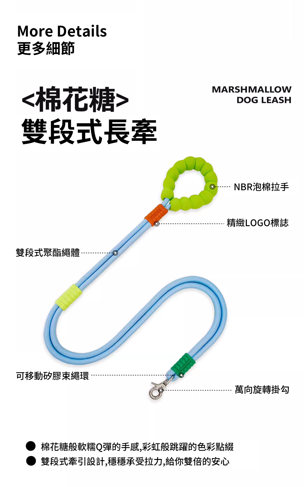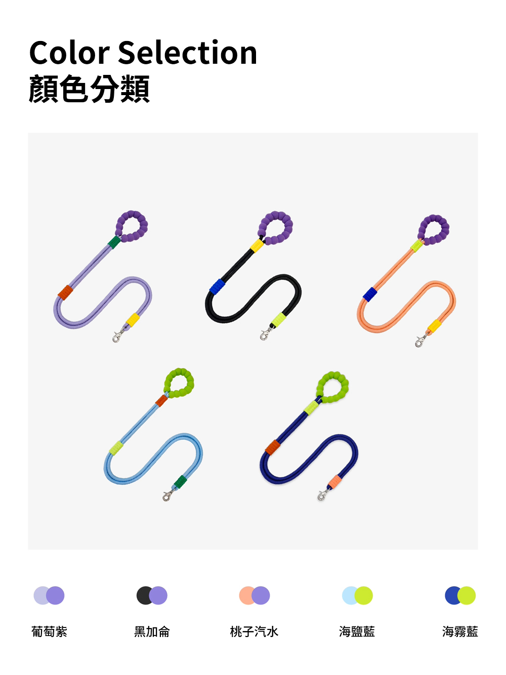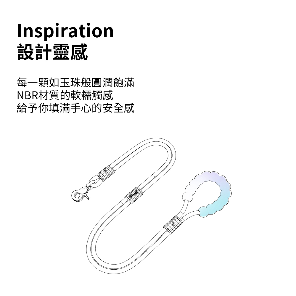 材質 : 滌綸圓繩、NBR泡綿拉手、珍珠銀合金掛鉤、矽膠束繩環